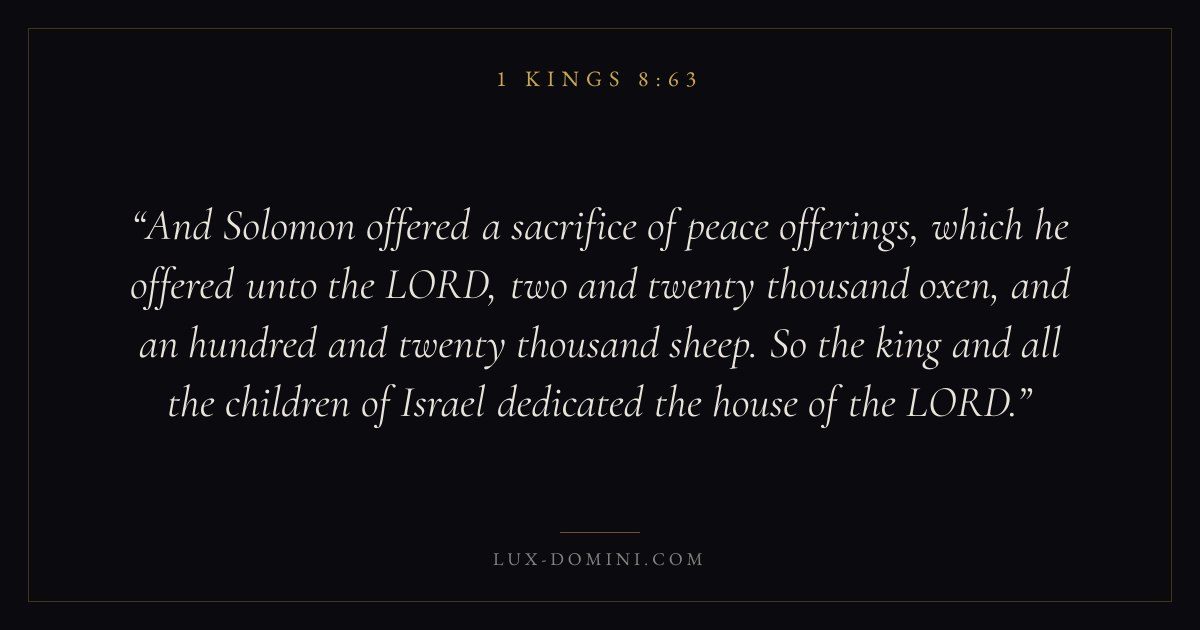 And Solomon offered a sacrifice of peace offerings, which he offered unto the LORD, two and twenty thousand oxen, and an hundred and twenty thousand sheep. So the king and all the children of Israel dedicated the house of the LORD.