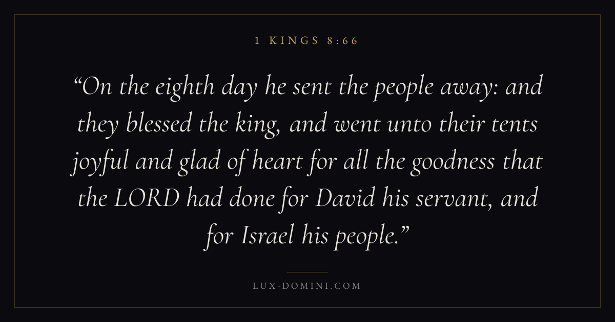 On the eighth day he sent the people away: and they blessed the king, and went unto their tents joyful and glad of heart for all the goodness that the LORD had done for David his servant, and for Israel his people.