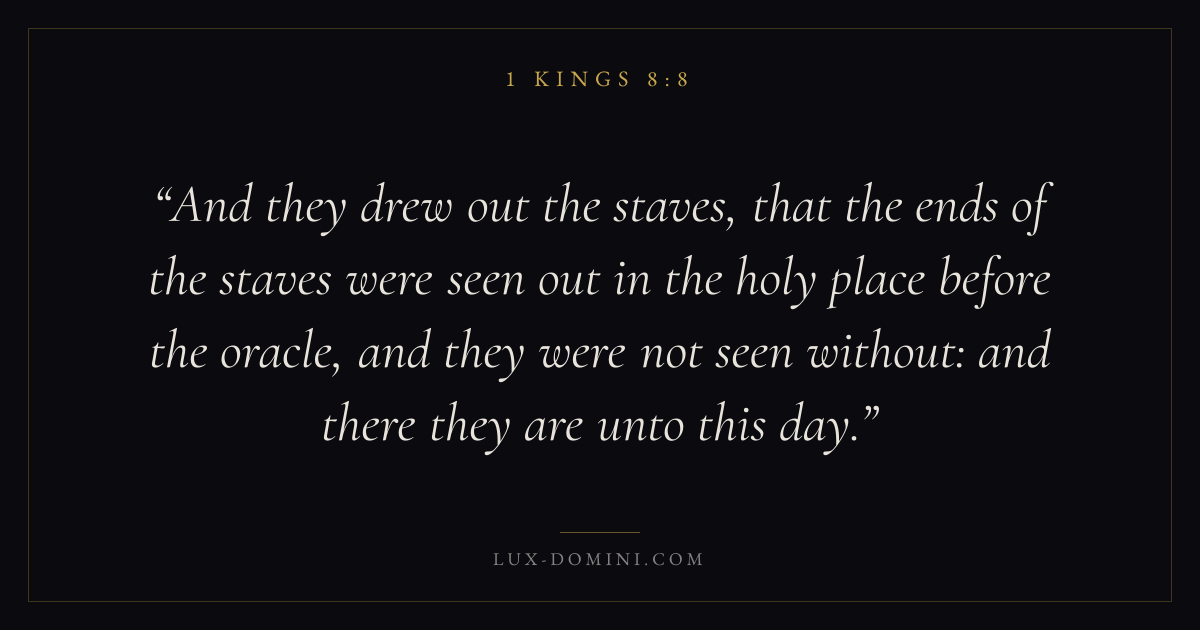 And they drew out the staves, that the ends of the staves were seen out in the holy place before the oracle, and they were not seen without: and there they are unto this day.