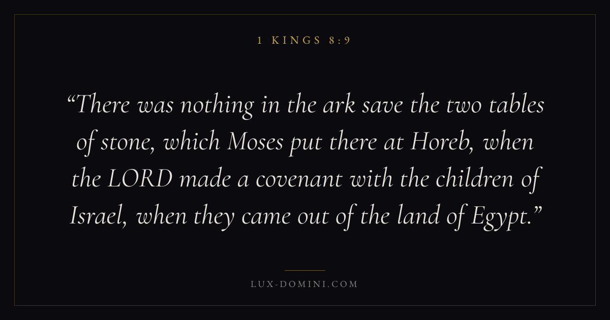 There was nothing in the ark save the two tables of stone, which Moses put there at Horeb, when the LORD made a covenant with the children of Israel, when they came out of the land of Egypt.