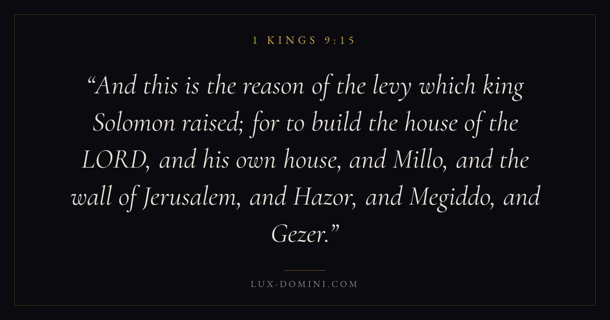 And this is the reason of the levy which king Solomon raised; for to build the house of the LORD, and his own house, and Millo, and the wall of Jerusalem, and Hazor, and Megiddo, and Gezer.