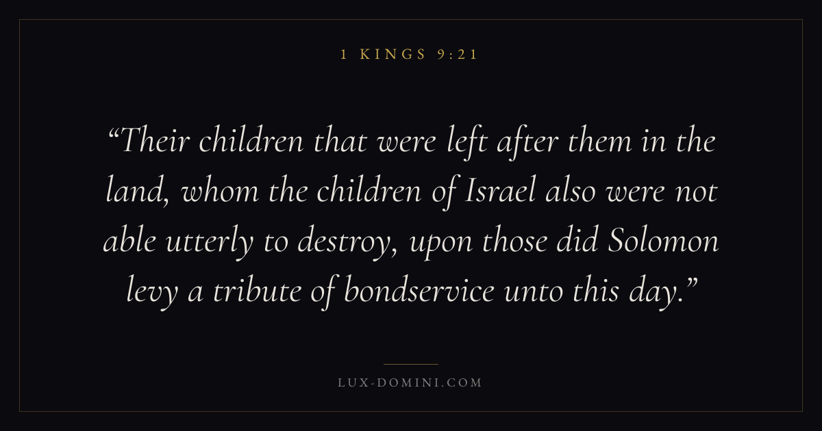 Their children that were left after them in the land, whom the children of Israel also were not able utterly to destroy, upon those did Solomon levy a tribute of bondservice unto this day.