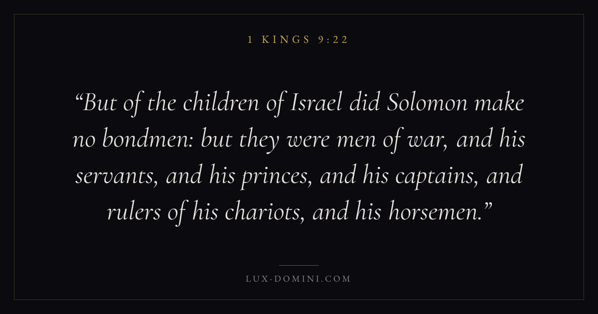 But of the children of Israel did Solomon make no bondmen: but they were men of war, and his servants, and his princes, and his captains, and rulers of his chariots, and his horsemen.