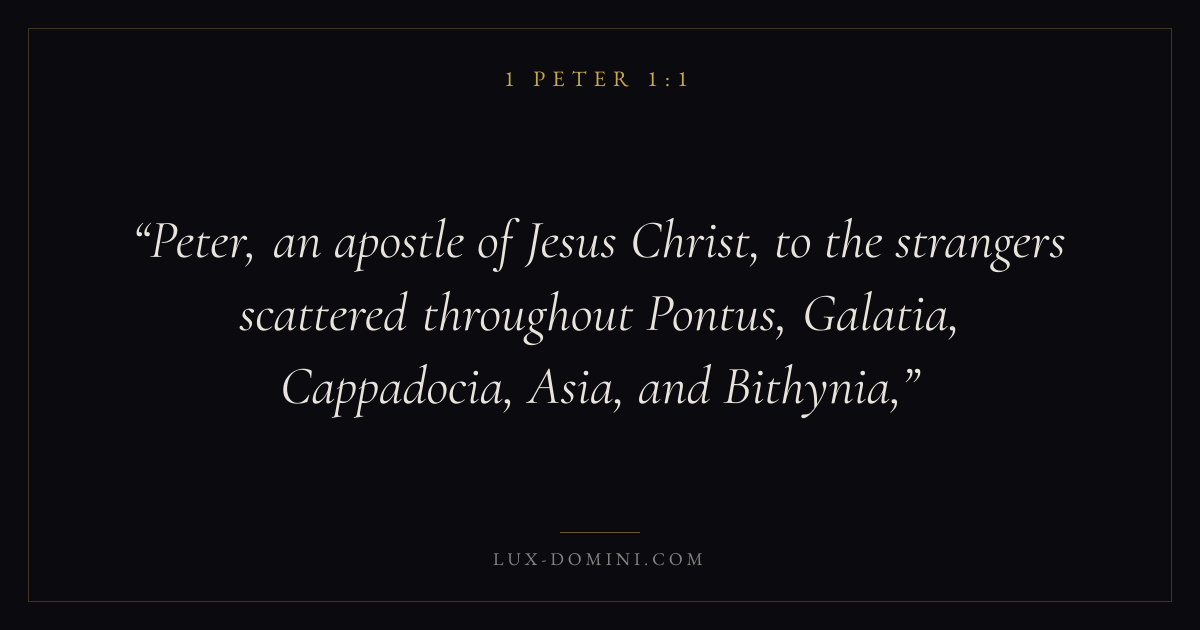 Peter, an apostle of Jesus Christ, to the strangers scattered throughout Pontus, Galatia, Cappadocia, Asia, and Bithynia,