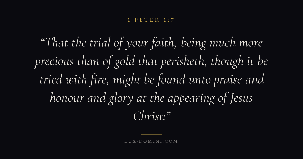 That the trial of your faith, being much more precious than of gold that perisheth, though it be tried with fire, might be found unto praise and honour and glory at the appearing of Jesus Christ: