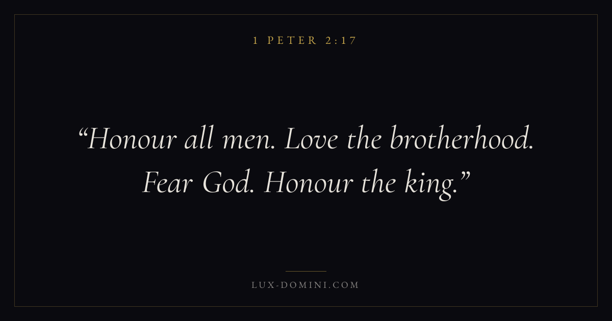 Honour all men. Love the brotherhood. Fear God. Honour the king.