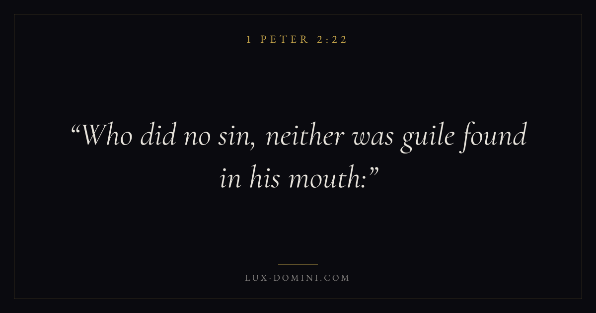 Books / 1 Peter / Chapter 2 / Verse 22 ← 1 Peter 2:21 1 Peter 2:22 1 Peter 2:23 → Who did no sin, neither was guile found in his mouth: Download verse card Share on Twitter Share on Facebook Pin it ✦ Key themes HopeAnxiety and fearSuffering and trialsTruthExile Read with 1 Peter 2:181 Peter 2:19Romans 8:24Revelation 21:4 Related topics Bible verses about hopeBible verses about anxiety and fearBible verses about suffering and trialsBible verses about truth ✦ 1 Peter Chapter 2 verses V. 1 V. 2 V. 3 V. 4 V. 5 V. 6 V. 7 V. 8 V. 9 V. 10 V. 11 V. 12 V. 13 V. 14 V. 15 V. 16 V. 17 V. 18 V. 19 V. 20 V. 21 V. 22 V. 23 V. 24 V. 25