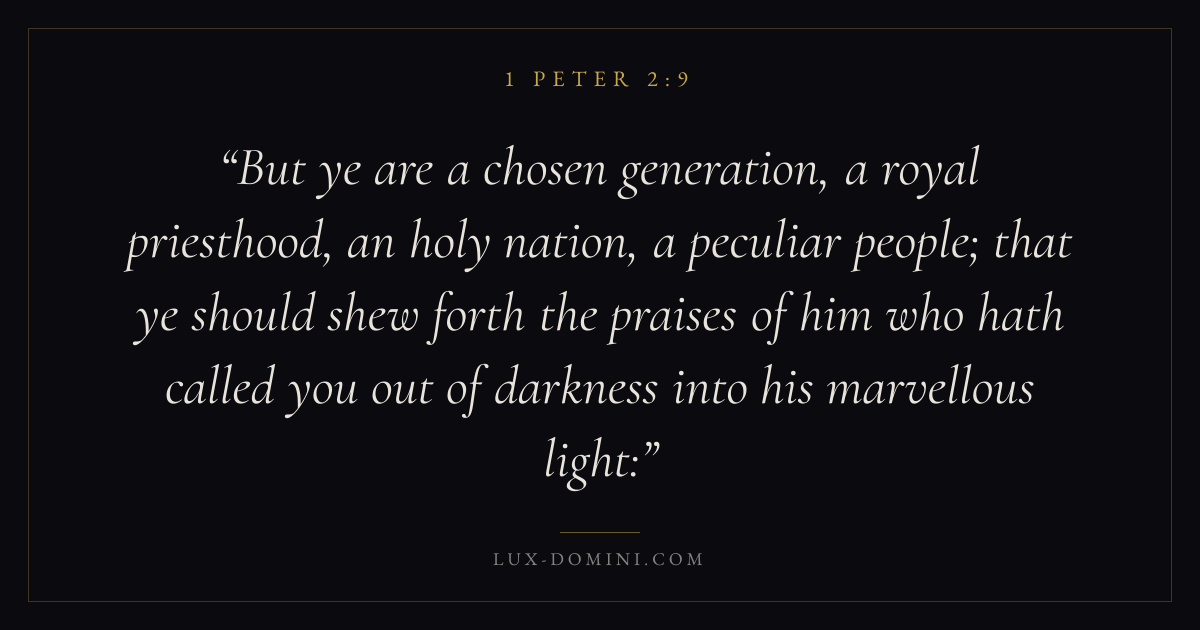 But ye are a chosen generation, a royal priesthood, an holy nation, a peculiar people; that ye should shew forth the praises of him who hath called you out of darkness into his marvellous light: