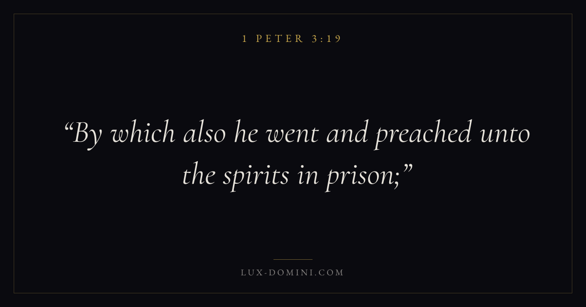 Books / 1 Peter / Chapter 3 / Verse 19 ← 1 Peter 3:18 1 Peter 3:19 1 Peter 3:20 → By which also he went and preached unto the spirits in prison; Download verse card Share on Twitter Share on Facebook Pin it ✦ Key themes HopeSuffering and trialsTruthExile Read with 1 Peter 3:181 Peter 3:20Romans 8:24Revelation 21:4 Related topics Bible verses about hopeBible verses about suffering and trialsBible verses about truth ✦ 1 Peter Chapter 3 verses V. 1 V. 2 V. 3 V. 4 V. 5 V. 6 V. 7 V. 8 V. 9 V. 10 V. 11 V. 12 V. 13 V. 14 V. 15 V. 16 V. 17 V. 18 V. 19 V. 20 V. 21 V. 22