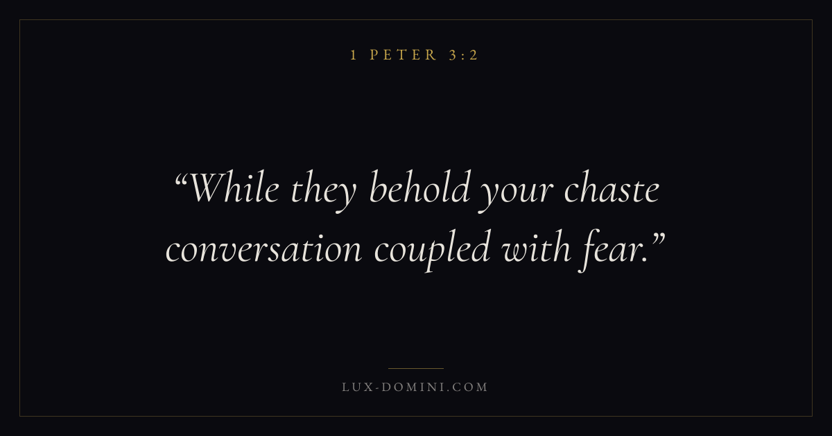 Books / 1 Peter / Chapter 3 / Verse 2 ← 1 Peter 3:1 1 Peter 3:2 1 Peter 3:3 → While they behold your chaste conversation coupled with fear. Download verse card Share on Twitter Share on Facebook Pin it ✦ Key themes HopeAnxiety and fearSuffering and trialsTruthExile Read with 1 Peter 3:1Romans 8:24Revelation 21:4Philippians 4:6 Related topics Bible verses about hopeBible verses about anxiety and fearBible verses about suffering and trialsBible verses about truth ✦ 1 Peter Chapter 3 verses V. 1 V. 2 V. 3 V. 4 V. 5 V. 6 V. 7 V. 8 V. 9 V. 10 V. 11 V. 12 V. 13 V. 14 V. 15 V. 16 V. 17 V. 18 V. 19 V. 20 V. 21 V. 22