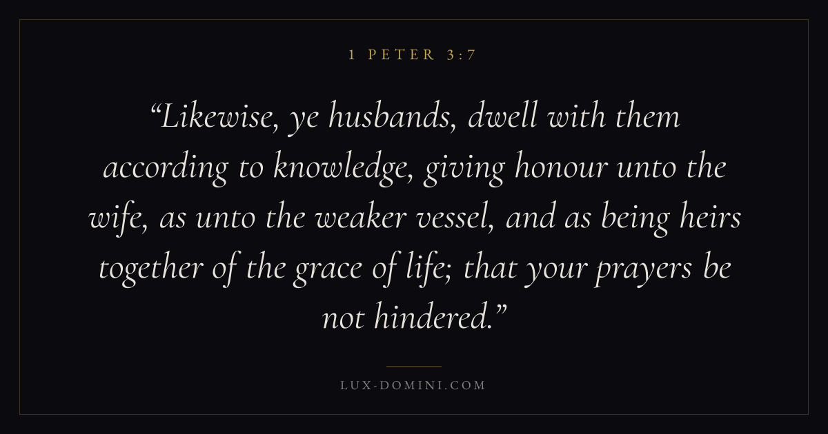 Likewise, ye husbands, dwell with them according to knowledge, giving honour unto the wife, as unto the weaker vessel, and as being heirs together of the grace of life; that your prayers be not hindered.