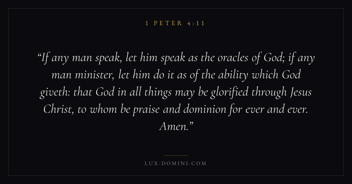 If any man speak, let him speak as the oracles of God; if any man minister, let him do it as of the ability which God giveth: that God in all things may be glorified through Jesus Christ, to whom be praise and dominion for ever and ever. Amen.