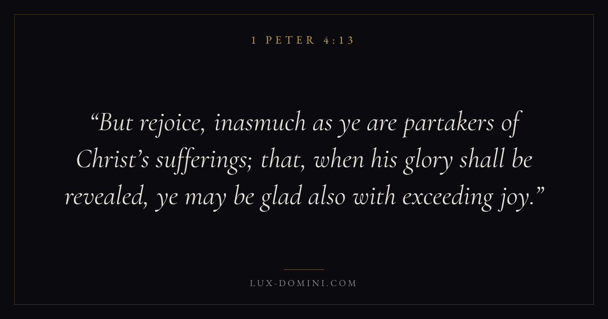 But rejoice, inasmuch as ye are partakers of Christ’s sufferings; that, when his glory shall be revealed, ye may be glad also with exceeding joy.