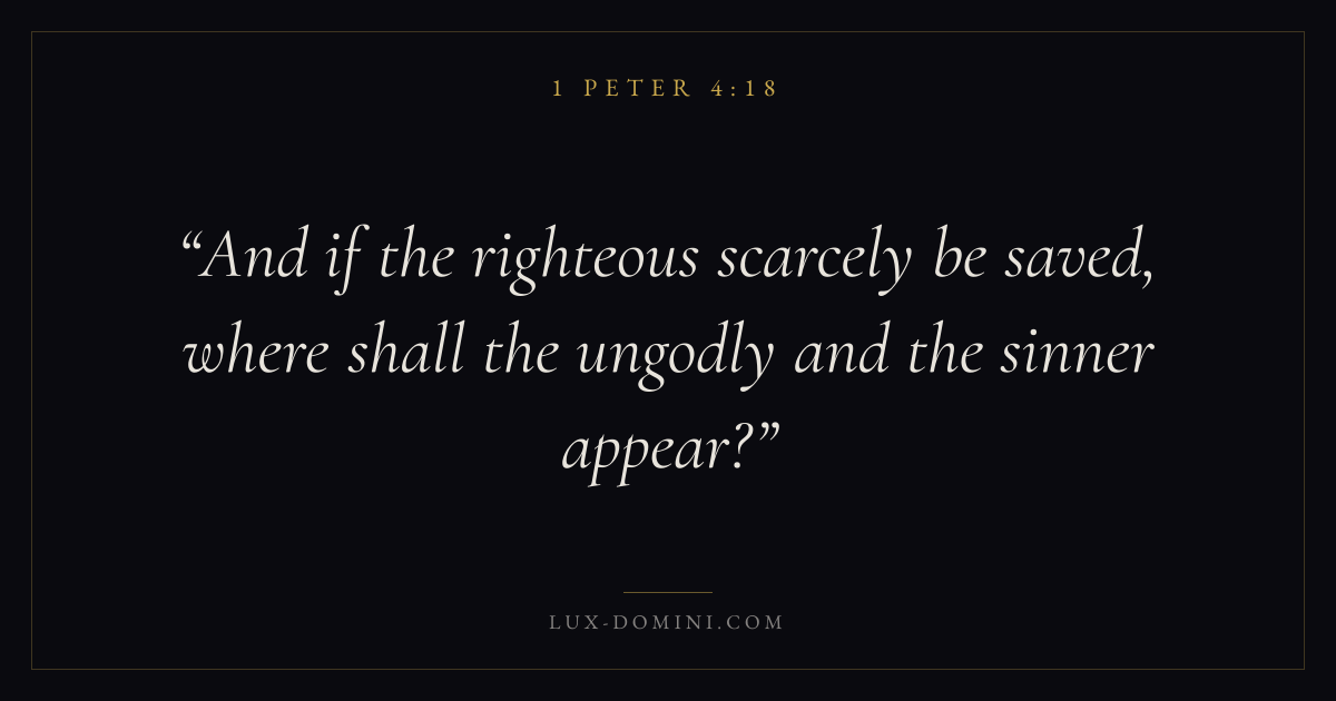Books / 1 Peter / Chapter 4 / Verse 18 ← 1 Peter 4:17 1 Peter 4:18 1 Peter 4:19 → And if the righteous scarcely be saved, where shall the ungodly and the sinner appear? Download verse card Share on Twitter Share on Facebook Pin it ✦ Key themes HopeSuffering and trialsSalvationTruthExile Read with 1 Peter 4:141 Peter 4:15Romans 8:24Revelation 21:4 Related topics Bible verses about hopeBible verses about suffering and trialsBible verses about salvationBible verses about truth ✦ 1 Peter Chapter 4 verses V. 1 V. 2 V. 3 V. 4 V. 5 V. 6 V. 7 V. 8 V. 9 V. 10 V. 11 V. 12 V. 13 V. 14 V. 15 V. 16 V. 17 V. 18 V. 19