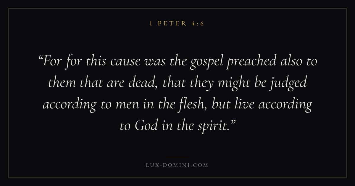 For for this cause was the gospel preached also to them that are dead, that they might be judged according to men in the flesh, but live according to God in the spirit.