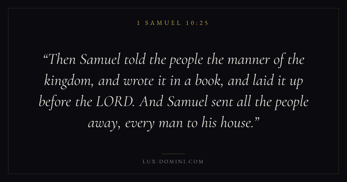 Then Samuel told the people the manner of the kingdom, and wrote it in a book, and laid it up before the LORD. And Samuel sent all the people away, every man to his house.