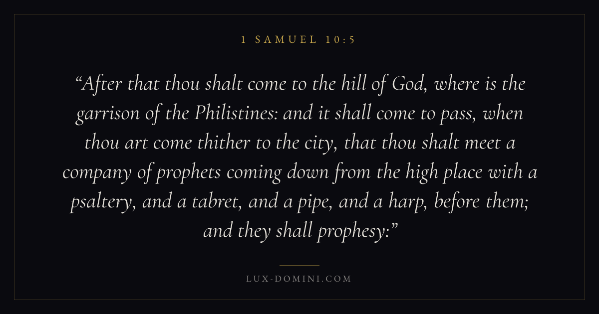 After that thou shalt come to the hill of God, where is the garrison of the Philistines: and it shall come to pass, when thou art come thither to the city, that thou shalt meet a company of prophets coming down from the high place with a psaltery, and a tabret, and a pipe, and a harp, before them; and they shall prophesy: