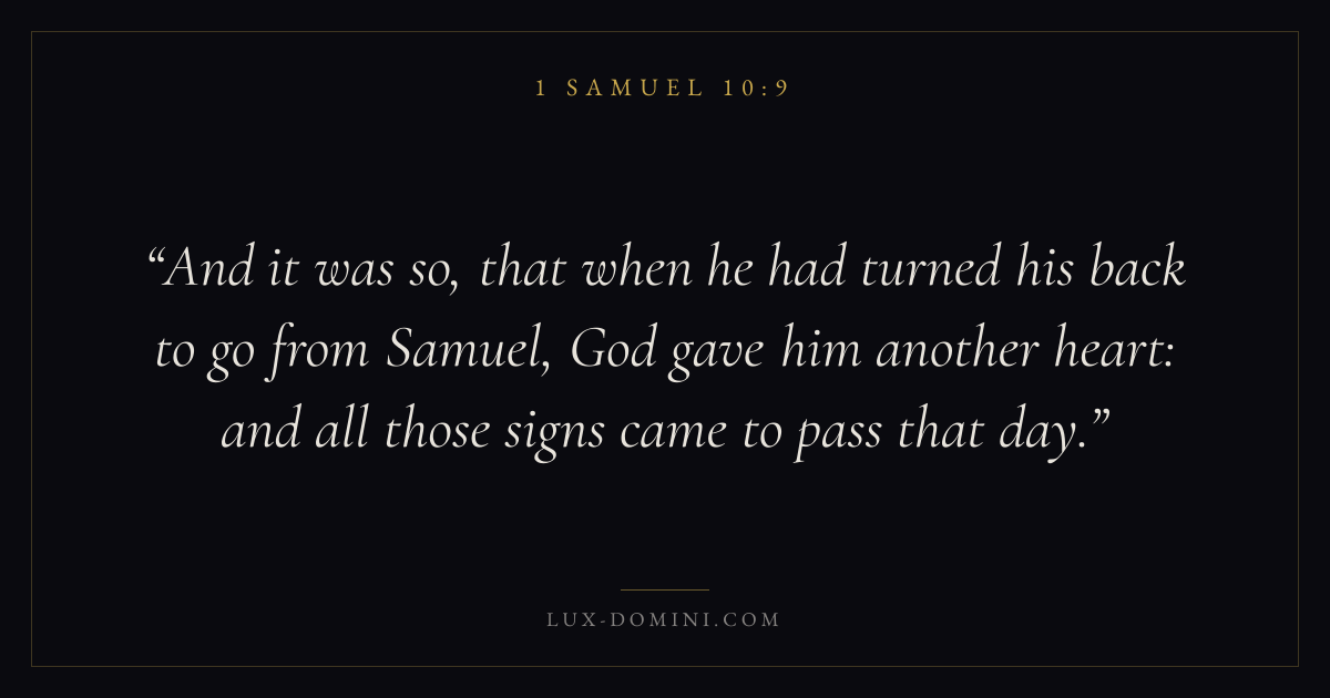 And it was so, that when he had turned his back to go from Samuel, God gave him another heart: and all those signs came to pass that day.