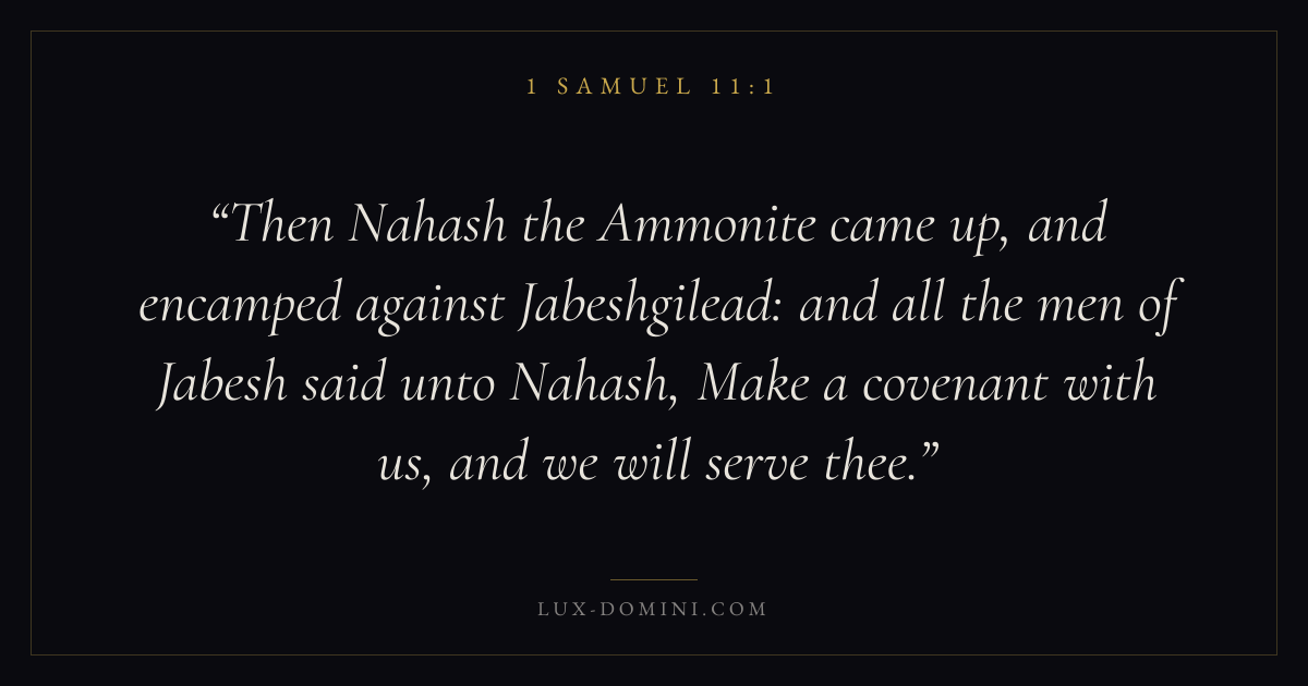 Then Nahash the Ammonite came up, and encamped against Jabeshgilead: and all the men of Jabesh said unto Nahash, Make a covenant with us, and we will serve thee.