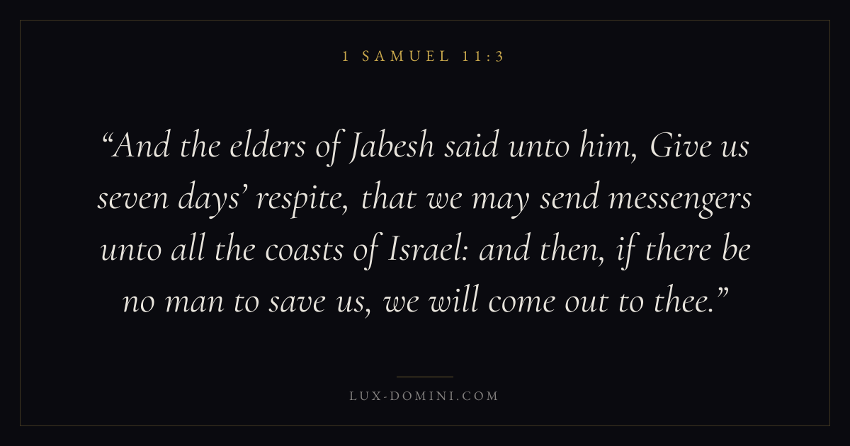 And the elders of Jabesh said unto him, Give us seven days’ respite, that we may send messengers unto all the coasts of Israel: and then, if there be no man to save us, we will come out to thee.
