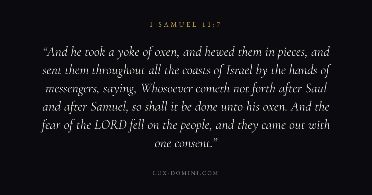 And he took a yoke of oxen, and hewed them in pieces, and sent them throughout all the coasts of Israel by the hands of messengers, saying, Whosoever cometh not forth after Saul and after Samuel, so shall it be done unto his oxen. And the fear of the LORD fell on the people, and they came out with one consent.