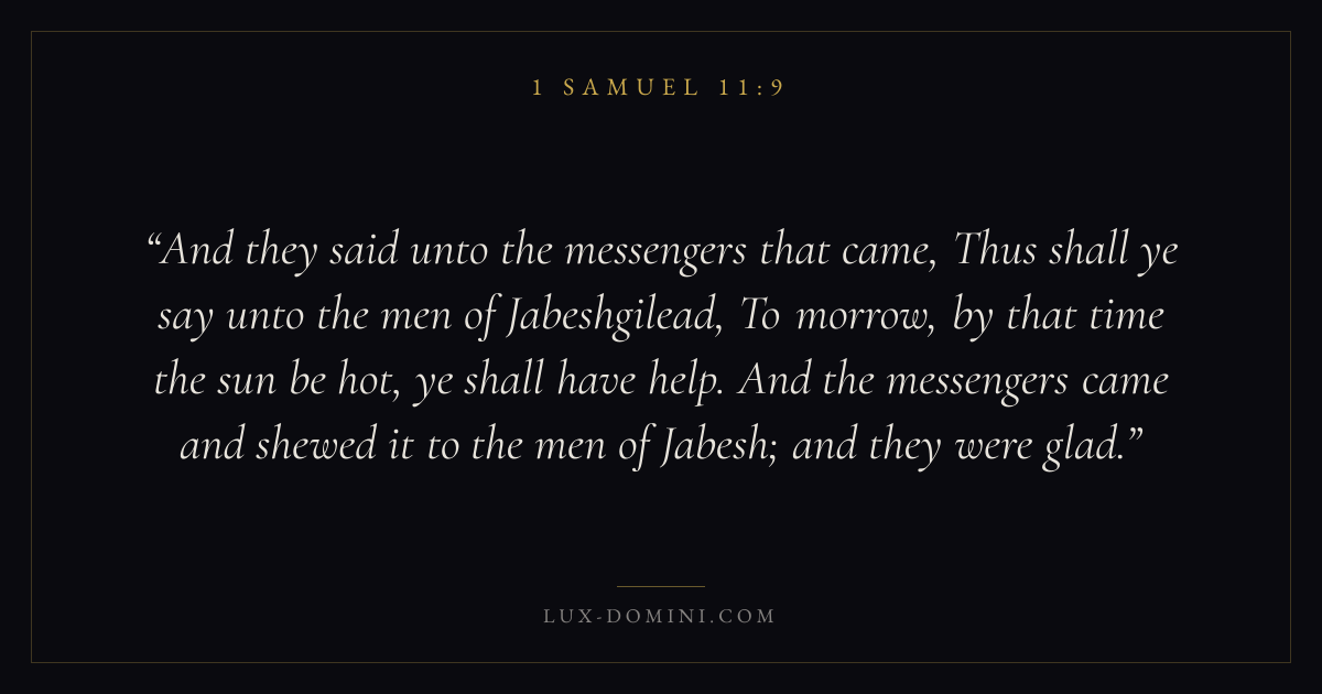 And they said unto the messengers that came, Thus shall ye say unto the men of Jabeshgilead, To morrow, by that time the sun be hot, ye shall have help. And the messengers came and shewed it to the men of Jabesh; and they were glad.