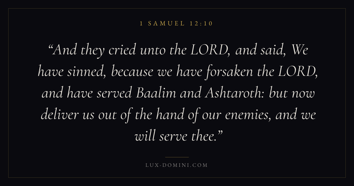 And they cried unto the LORD, and said, We have sinned, because we have forsaken the LORD, and have served Baalim and Ashtaroth: but now deliver us out of the hand of our enemies, and we will serve thee.