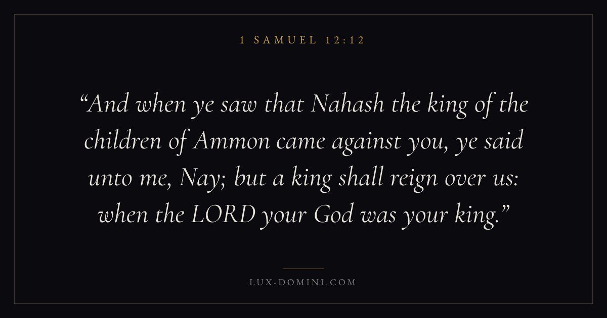 And when ye saw that Nahash the king of the children of Ammon came against you, ye said unto me, Nay; but a king shall reign over us: when the LORD your God was your king.