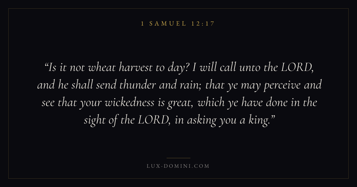 Is it not wheat harvest to day? I will call unto the LORD, and he shall send thunder and rain; that ye may perceive and see that your wickedness is great, which ye have done in the sight of the LORD, in asking you a king.