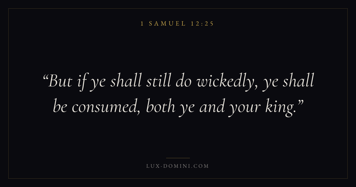 Books / 1 Samuel / Chapter 12 / Verse 25 ← 1 Samuel 12:24 1 Samuel 12:25 1 Samuel 13:1 → But if ye shall still do wickedly, ye shall be consumed, both ye and your king. Download verse card Share on Twitter Share on Facebook Pin it ✦ Key themes HopePrayerPeaceTruthLeadership Read with 1 Samuel 12:231 Samuel 12:24Romans 8:24Revelation 21:4 Related topics Bible verses about hopeBible verses about prayerBible verses about peaceBible verses about truthBible verses about leadership ✦ 1 Samuel Chapter 12 verses V. 1 V. 2 V. 3 V. 4 V. 5 V. 6 V. 7 V. 8 V. 9 V. 10 V. 11 V. 12 V. 13 V. 14 V. 15 V. 16 V. 17 V. 18 V. 19 V. 20 V. 21 V. 22 V. 23 V. 24 V. 25