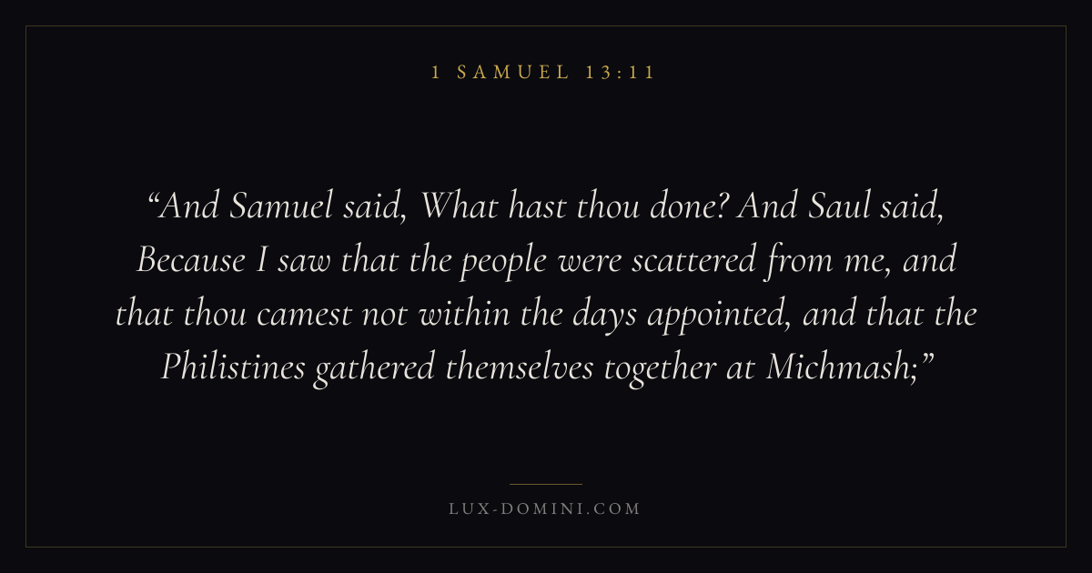 And Samuel said, What hast thou done? And Saul said, Because I saw that the people were scattered from me, and that thou camest not within the days appointed, and that the Philistines gathered themselves together at Michmash;