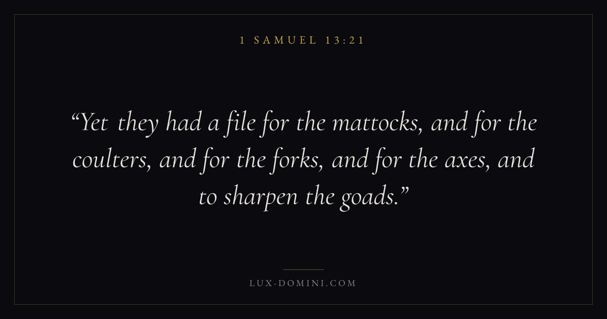 Yet they had a file for the mattocks, and for the coulters, and for the forks, and for the axes, and to sharpen the goads.