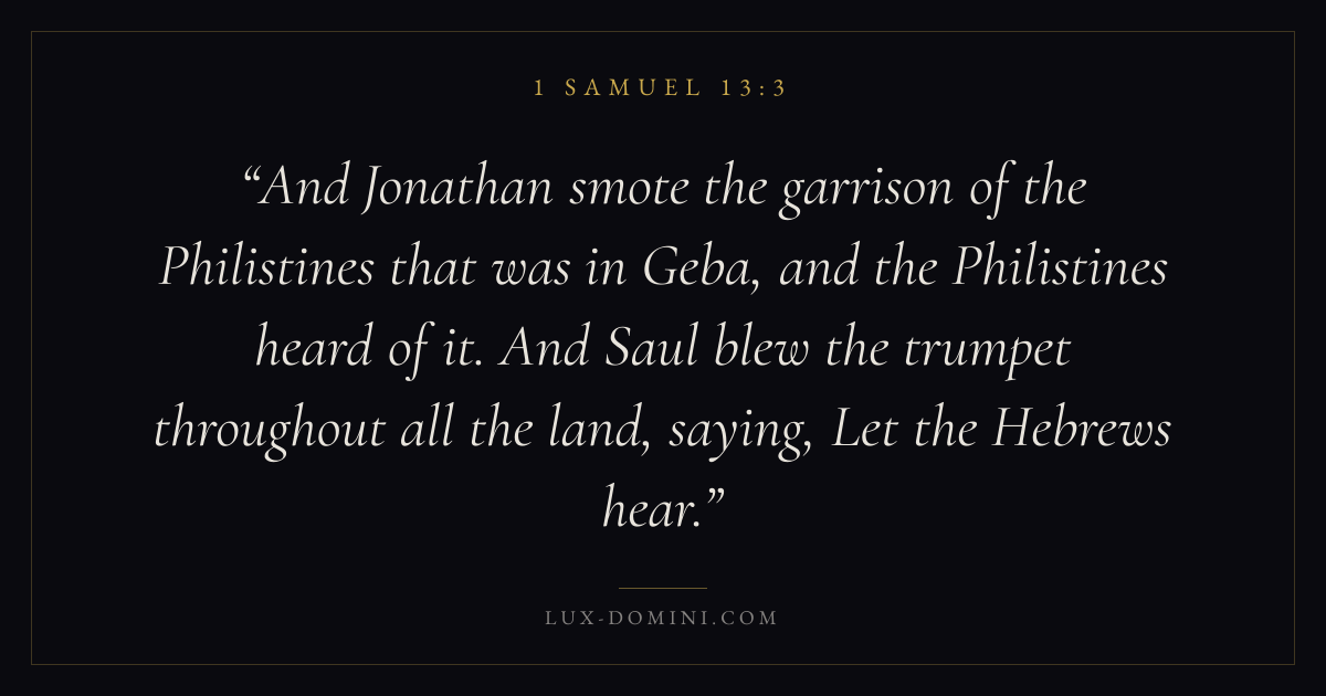 And Jonathan smote the garrison of the Philistines that was in Geba, and the Philistines heard of it. And Saul blew the trumpet throughout all the land, saying, Let the Hebrews hear.