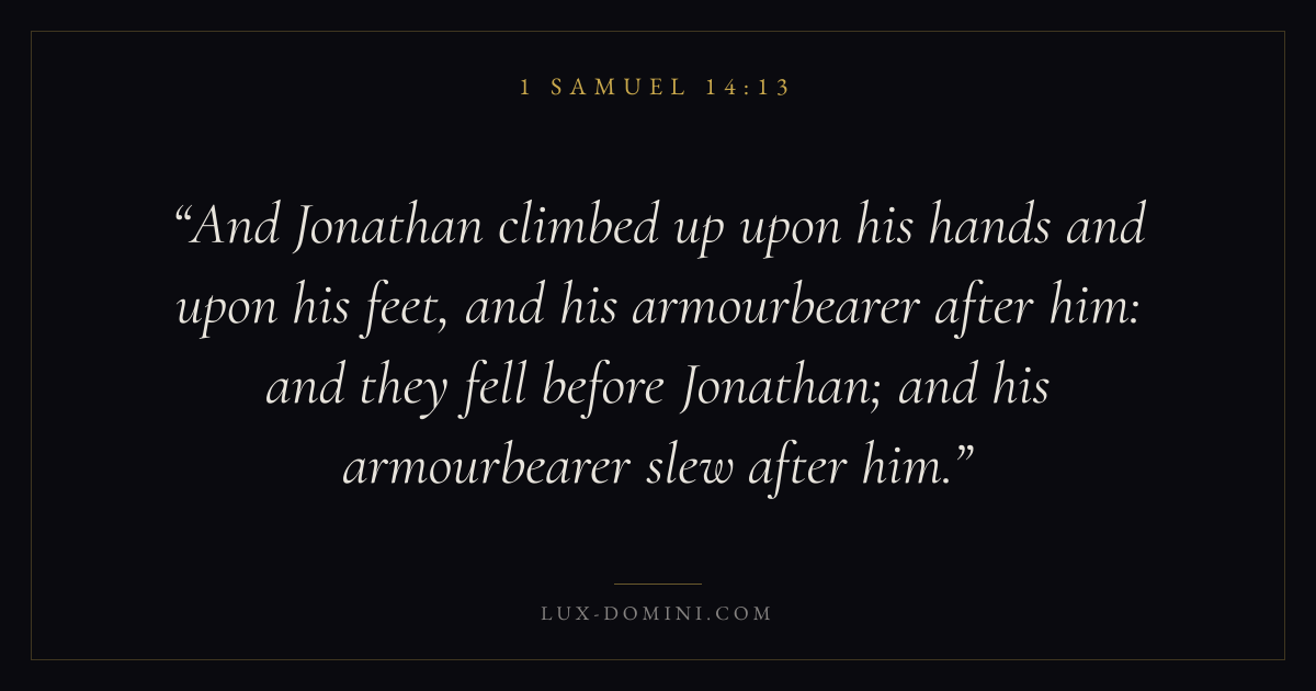 And Jonathan climbed up upon his hands and upon his feet, and his armourbearer after him: and they fell before Jonathan; and his armourbearer slew after him.