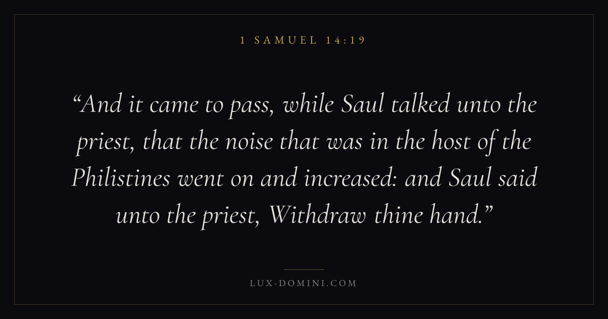 And it came to pass, while Saul talked unto the priest, that the noise that was in the host of the Philistines went on and increased: and Saul said unto the priest, Withdraw thine hand.