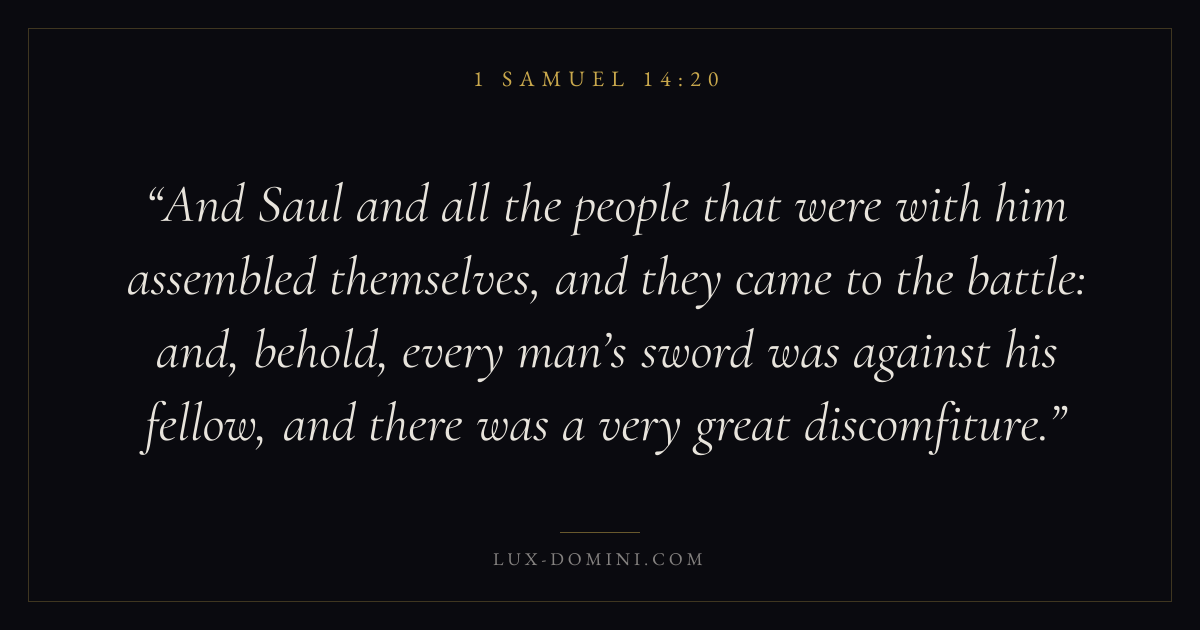 And Saul and all the people that were with him assembled themselves, and they came to the battle: and, behold, every man’s sword was against his fellow, and there was a very great discomfiture.