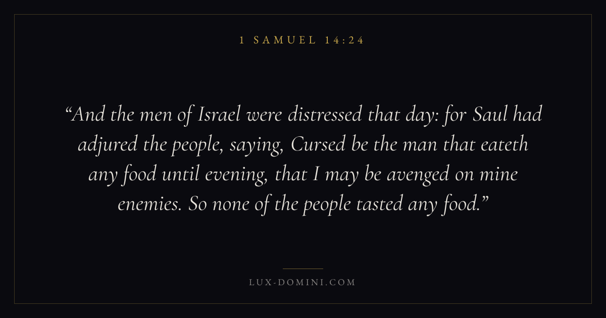 And the men of Israel were distressed that day: for Saul had adjured the people, saying, Cursed be the man that eateth any food until evening, that I may be avenged on mine enemies. So none of the people tasted any food.