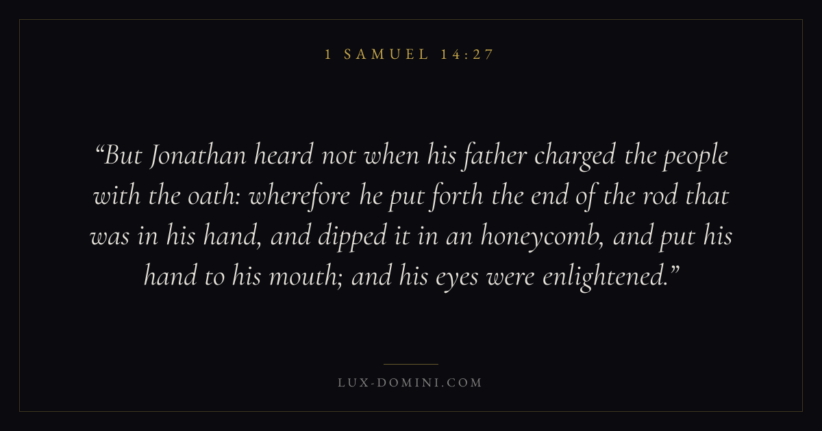 But Jonathan heard not when his father charged the people with the oath: wherefore he put forth the end of the rod that was in his hand, and dipped it in an honeycomb, and put his hand to his mouth; and his eyes were enlightened.