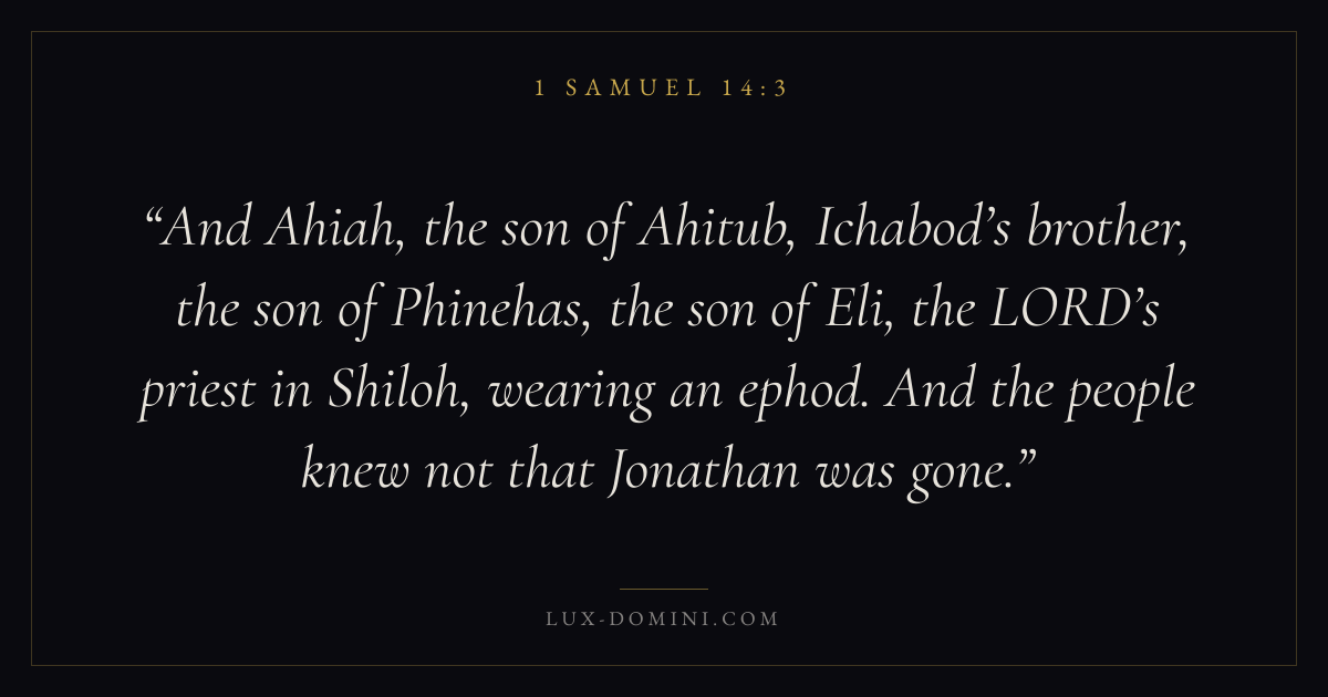 And Ahiah, the son of Ahitub, Ichabod’s brother, the son of Phinehas, the son of Eli, the LORD’s priest in Shiloh, wearing an ephod. And the people knew not that Jonathan was gone.
