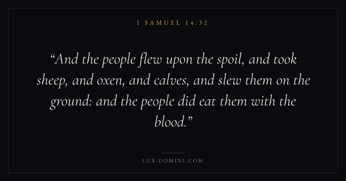 And the people flew upon the spoil, and took sheep, and oxen, and calves, and slew them on the ground: and the people did eat them with the blood.