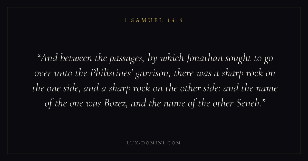 And between the passages, by which Jonathan sought to go over unto the Philistines’ garrison, there was a sharp rock on the one side, and a sharp rock on the other side: and the name of the one was Bozez, and the name of the other Seneh.