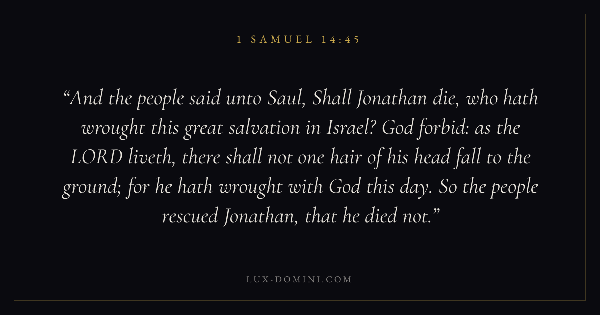And the people said unto Saul, Shall Jonathan die, who hath wrought this great salvation in Israel? God forbid: as the LORD liveth, there shall not one hair of his head fall to the ground; for he hath wrought with God this day. So the people rescued Jonathan, that he died not.