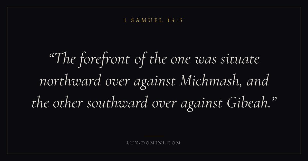The forefront of the one was situate northward over against Michmash, and the other southward over against Gibeah.
