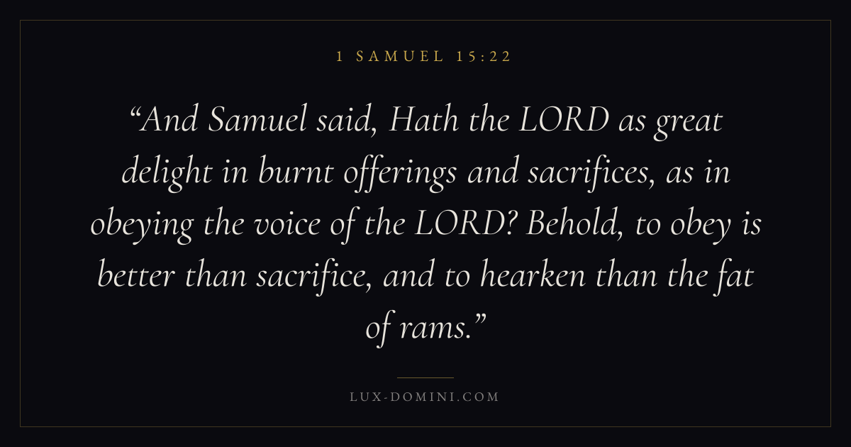 And Samuel said, Hath the LORD as great delight in burnt offerings and sacrifices, as in obeying the voice of the LORD? Behold, to obey is better than sacrifice, and to hearken than the fat of rams.