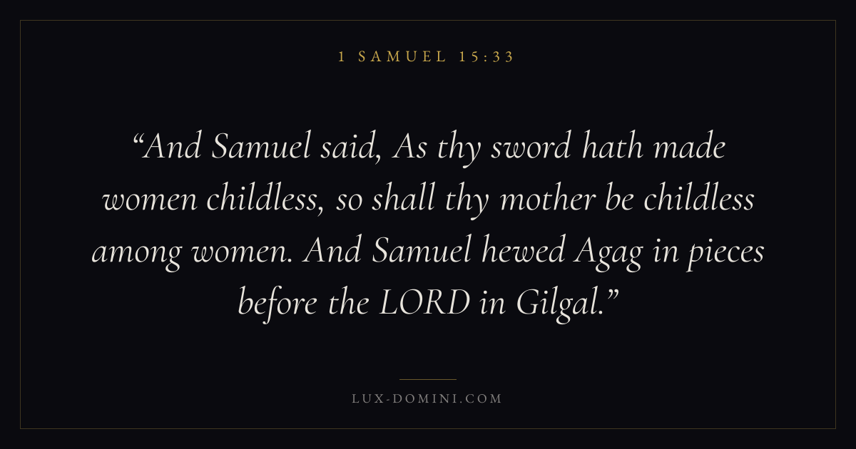 And Samuel said, As thy sword hath made women childless, so shall thy mother be childless among women. And Samuel hewed Agag in pieces before the LORD in Gilgal.