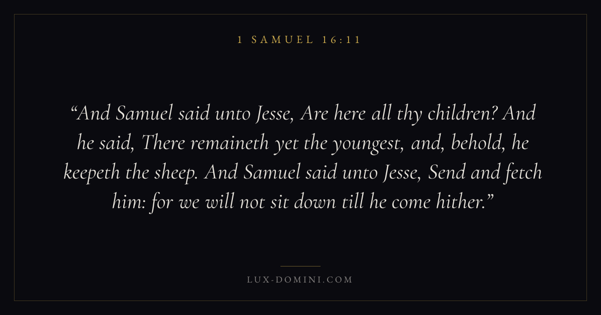 And Samuel said unto Jesse, Are here all thy children? And he said, There remaineth yet the youngest, and, behold, he keepeth the sheep. And Samuel said unto Jesse, Send and fetch him: for we will not sit down till he come hither.