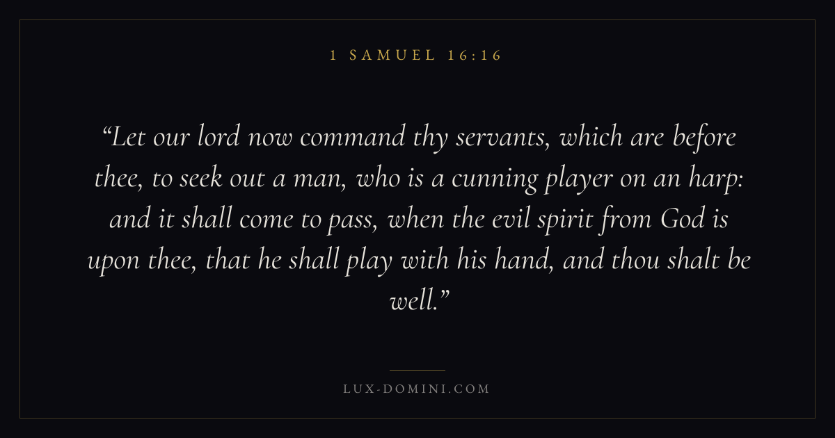 Let our lord now command thy servants, which are before thee, to seek out a man, who is a cunning player on an harp: and it shall come to pass, when the evil spirit from God is upon thee, that he shall play with his hand, and thou shalt be well.