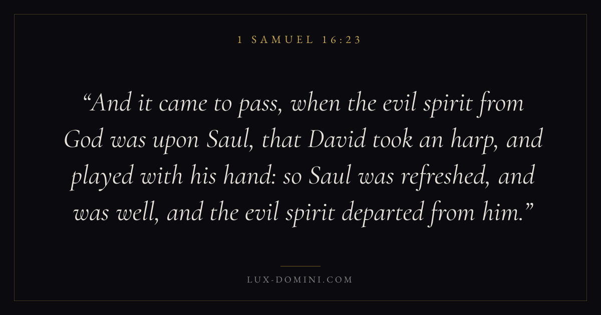 And it came to pass, when the evil spirit from God was upon Saul, that David took an harp, and played with his hand: so Saul was refreshed, and was well, and the evil spirit departed from him.