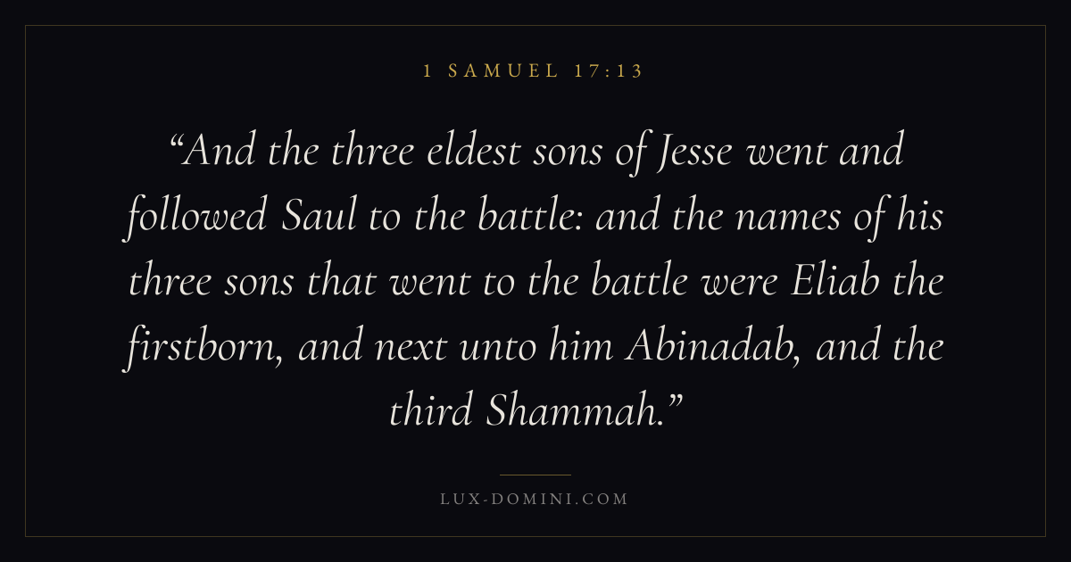 And the three eldest sons of Jesse went and followed Saul to the battle: and the names of his three sons that went to the battle were Eliab the firstborn, and next unto him Abinadab, and the third Shammah.
