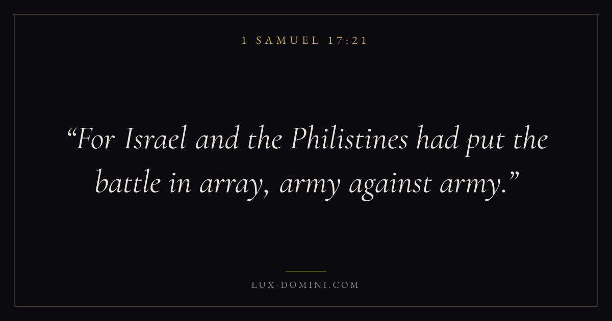 Books / 1 Samuel / Chapter 17 / Verse 21 ← 1 Samuel 17:20 1 Samuel 17:21 1 Samuel 17:22 → For Israel and the Philistines had put the battle in array, army against army. Download verse card Share on Twitter Share on Facebook Pin it ✦ Key themes HopeWisdomLeadershipAnointing Read with 1 Samuel 17:201 Samuel 17:22Romans 8:24Revelation 21:4 Related topics Bible verses about hopeBible verses about wisdomBible verses about leadership ✦ 1 Samuel Chapter 17 verses V. 1 V. 2 V. 3 V. 4 V. 5 V. 6 V. 7 V. 8 V. 9 V. 10 V. 11 V. 12 V. 13 V. 14 V. 15 V. 16 V. 17 V. 18 V. 19 V. 20 V. 21 V. 22 V. 23 V. 24 V. 25 V. 26 V. 27 V. 28 V. 29 V. 30 V. 31 V. 32 V. 33 V. 34 V. 35 V. 36 V. 37 V. 38 V. 39 V. 40 V. 41 V. 42 V. 43 V. 44 V. 45 V. 46 V. 47 V. 48 V. 49 V. 50 V. 51 V. 52 V. 53 V. 54 V. 55 V. 56 V. 57 V. 58
